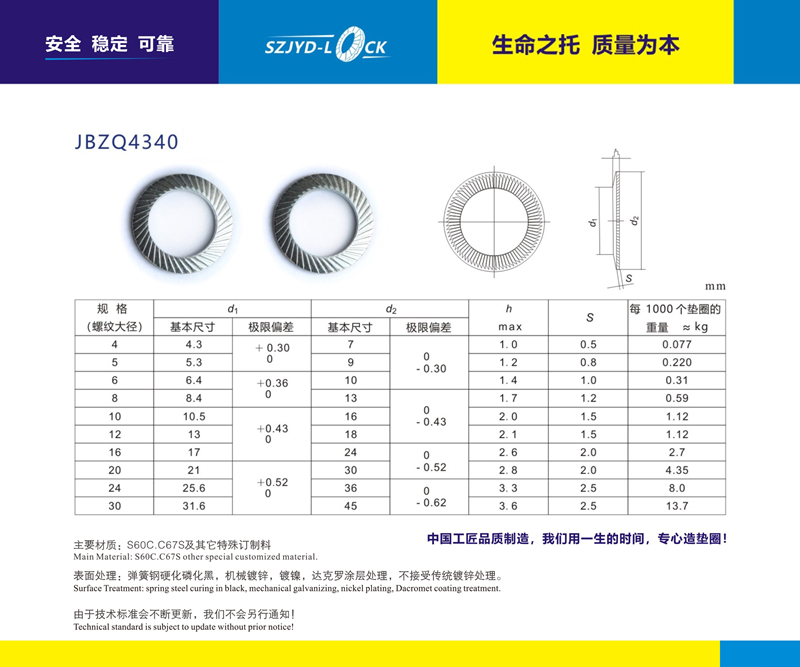 JBZQ4340防松墊圈、執(zhí)行中國機(jī)械標(biāo)準(zhǔn)、通常配合8.8級以上螺栓使用!技術(shù)成熟、性能穩(wěn)定、性價比高正在被越來越多的工業(yè)裝備領(lǐng)域大量使用!